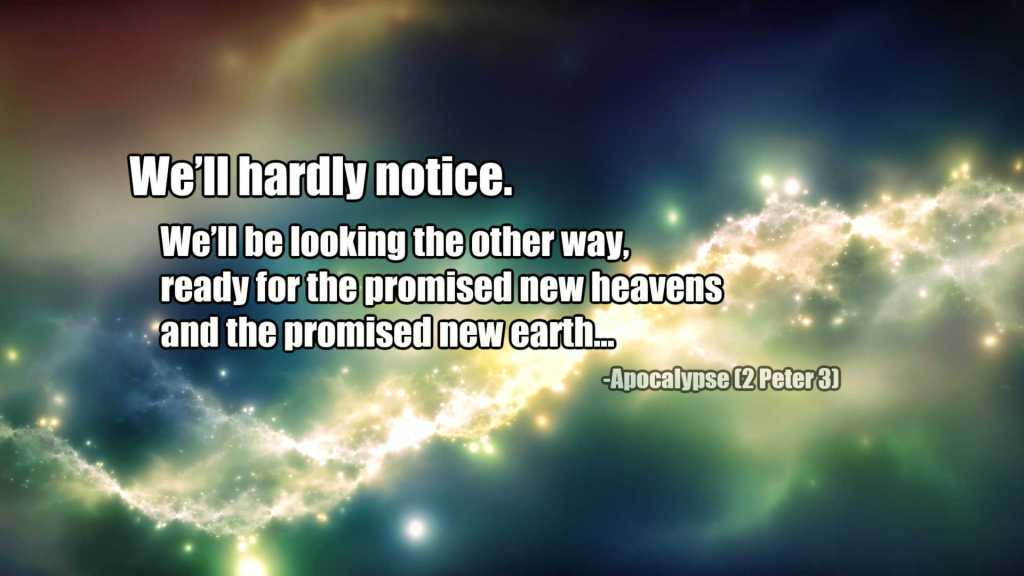 Since everything here today might well be gone tomorrow, do you see how essential it is to live a holy life? Daily expect the Day of God, eager for its arrival. The galaxies will burn up and the elements melt down that day—but we’ll hardly notice. We’ll be looking the other way, ready for the promised new heavens and the promised new earth, all landscaped with righteousness.