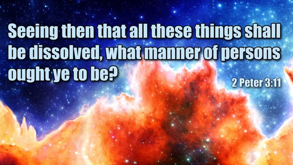 Seeing then that all these things shall be dissolved, what manner of persons ought ye to be in all holy conversation and godliness, looking for and hasting unto the coming of the day of God, wherein the heavens being on fire shall be dissolved, and the elements shall melt with fervent heat?